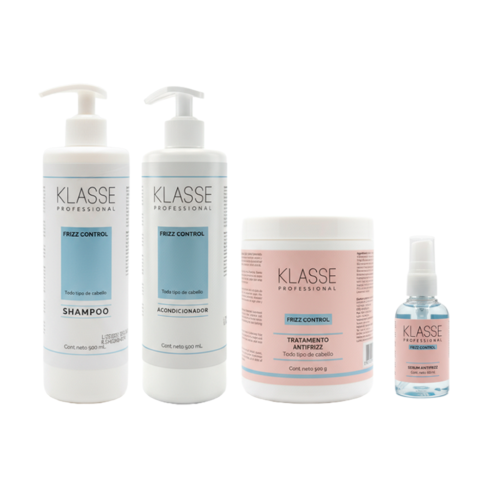 - Klasse Professional Shampoo Frizz Control formulado con fitoqueratina. un activo vegetal rico en aminoácidos que imita la estructura de la queratina natural del cabello. Su accion reparadora penetra en la fibra capilar, ayudando a restaurar la estructura interna, controlar el frizzy alinear la cutícula. Limpia eficazmente sin resecar, dejando el cabello más suave, brillante y manejable desde la primera aplicación.