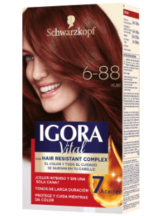 Tinte Igora Vital 6-88 RUBI contiene un tratamiento de 7 aceites y el Hair Resistant Complex, los aliados perfectos para disminuir el daño en cada coloración, menos puntas abiertas con brillo y suavidad con keratina y serina.