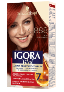 Tinte Igora Vital 6-888 RUBI APASIONADO contiene un tratamiento de 7 aceites y el Hair Resistant Complex, los aliados perfectos para disminuir el daño en cada coloración, menos puntas abiertas con brillo y suavidad con keratina y serina.