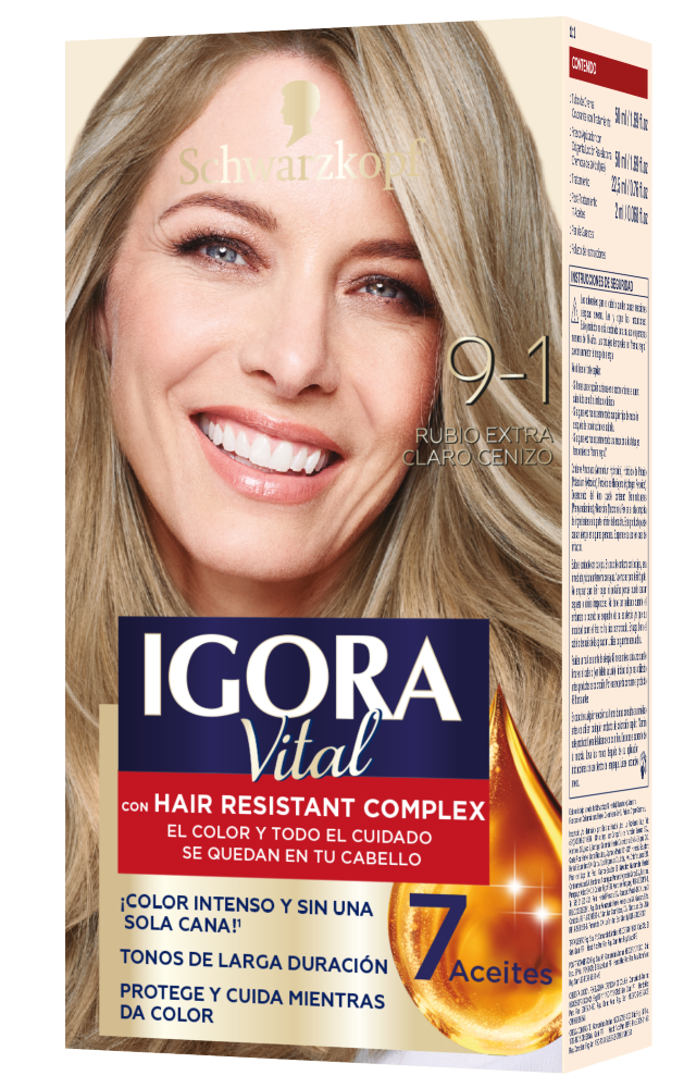 Tinte Igora 9-1 RUBIO EXTRA CLARO CENIZO contiene un tratamiento de 7 aceites y el Hair Resistant Complex, los aliados perfectos para disminuir el daño en cada coloración, menos puntas abiertas con brillo y suavidad con keratina y serina.