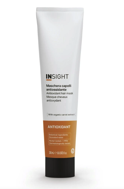 La mascarilla capilar antioxidante Insight contiene un fitocomplejo iluminador, antioxidante y regenerador compuesto de extracto de zanahoria orgánica, manteca de soja y aceite de avellana.