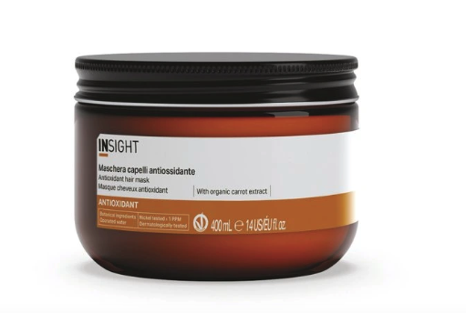 La mascarilla capilar antioxidante Insight contiene un fitocomplejo iluminador, antioxidante y regenerador compuesto de extracto de zanahoria orgánica, manteca de soja y aceite de avellana.