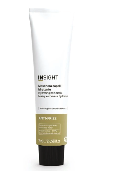 La mascarilla hidratante para el cabello Insight contiene extracto de amaranto orgánico, extracto de linaza orgánico y aceite de semilla de algodón, que tienen efectos fortalecedores e hidratantes.