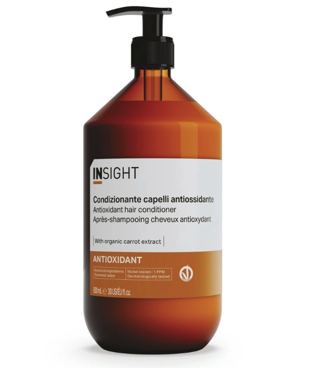 El acondicionador capilar antioxidante Insight contiene un fitocomplejo iluminador, antioxidante y regenerador compuesto de extracto de zanahoria orgánica, manteca de soja y aceite de avellana.